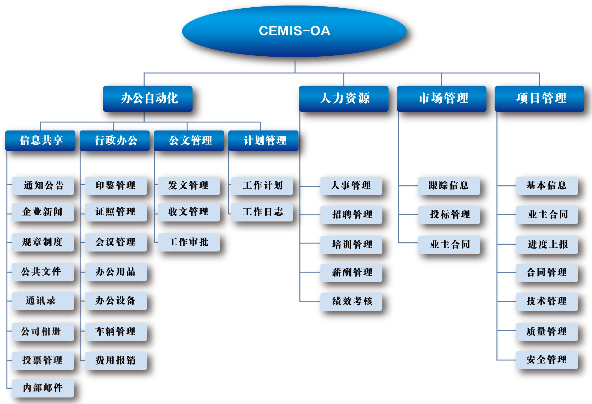 CEMIS-OA涵蓋了施工企業(yè)主要業(yè)務(wù)部門的核心業(yè)務(wù)流程,既包括總部機(jī)關(guān)的各種通知、公告、公文、資料和業(yè)務(wù)單據(jù)審批,也包括了市場部項目跟蹤、投標(biāo)、中標(biāo)、簽訂合同整個業(yè)務(wù)流程,同時項目主要信息也一目了然,包括項目回款、進(jìn)度、合同、質(zhì)量、 安全、技術(shù)等。